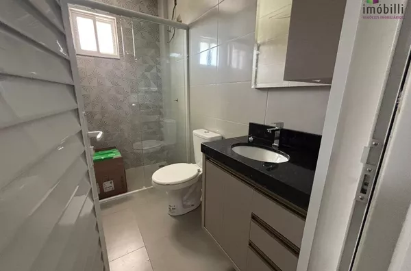 •Banheiro completo, com móveis sob medida e box de vidro.