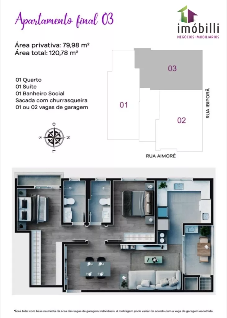 Com 79,98m2 de área privativa de apartamento, 121,82m2 de área total incluindo a garagem.