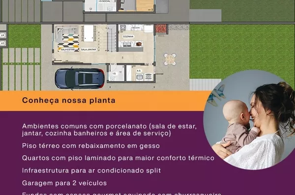 Com 03 quartos sendo 01 suíte, todos com sacada, cozinha, área de serviço, churrasqueira, lavabo, garagem para 02 carros, sobra de terreno nos fundos.