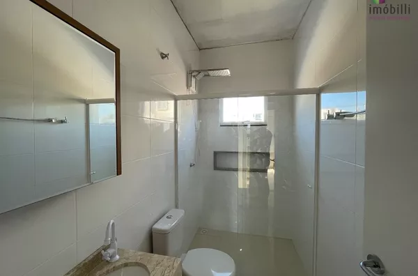 Com 02 quartos, sendo um com sacada, banheiro social, lavabo, sala tv, cozinha com móveis planejados, área de serviço, garagem, sobra de terreno nos fundos.